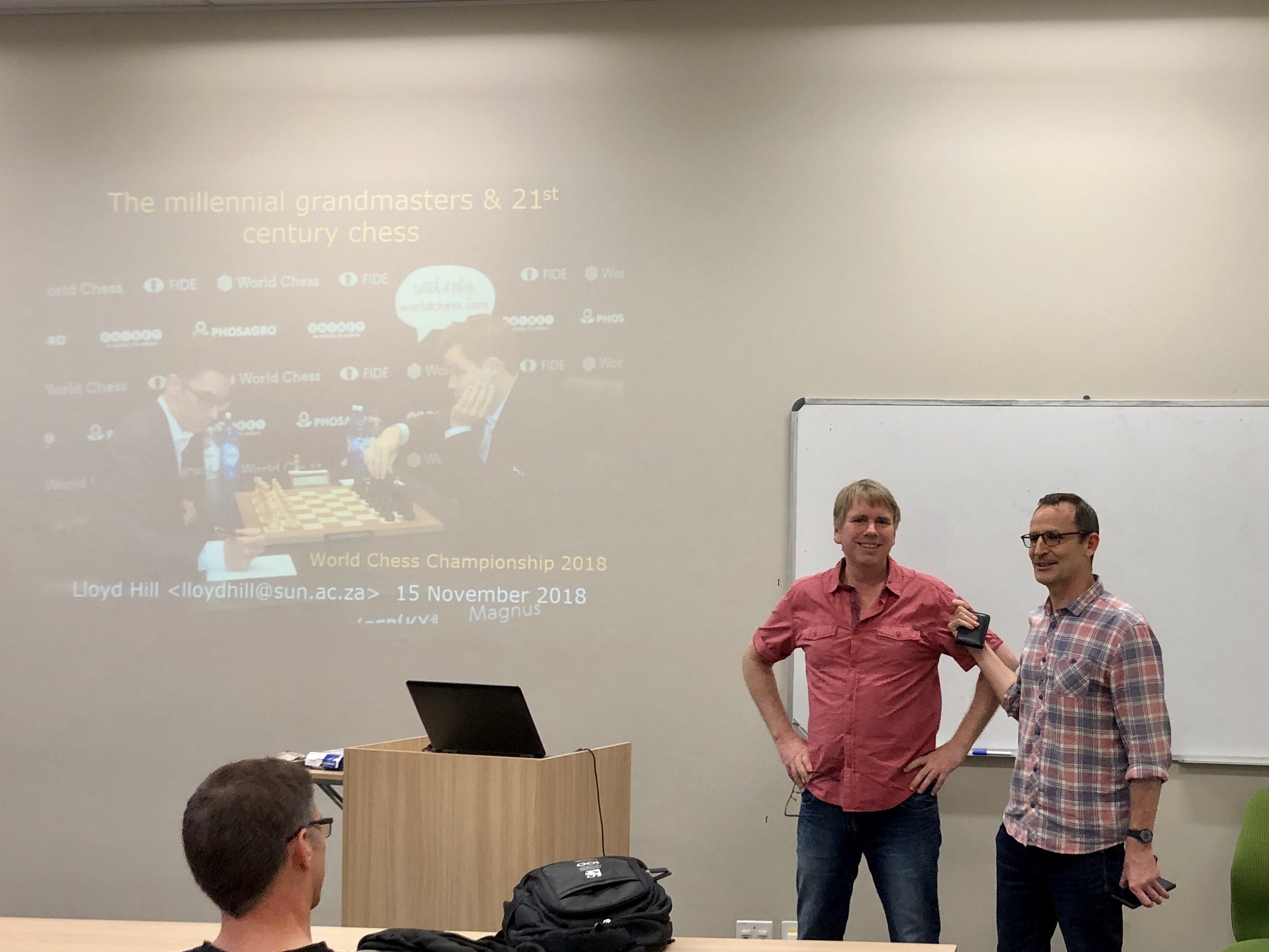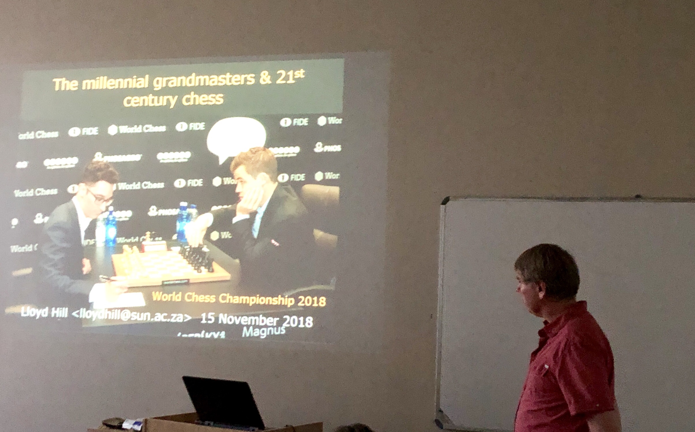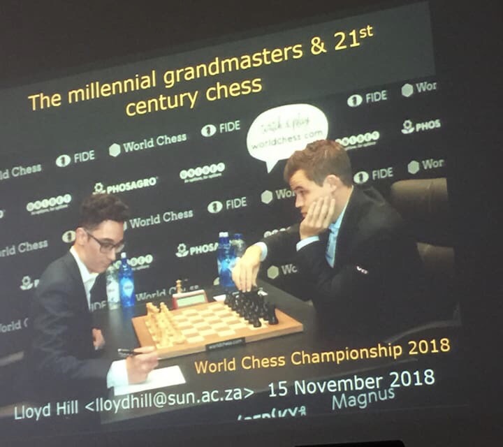 Dr Lloyd Hill of the Stellenbosch Chess Club gave a talk on the World match titled: The Millennial Grand Masters and 21st Century Chess hosted by the Club on Thursday evening 15 November 2018.